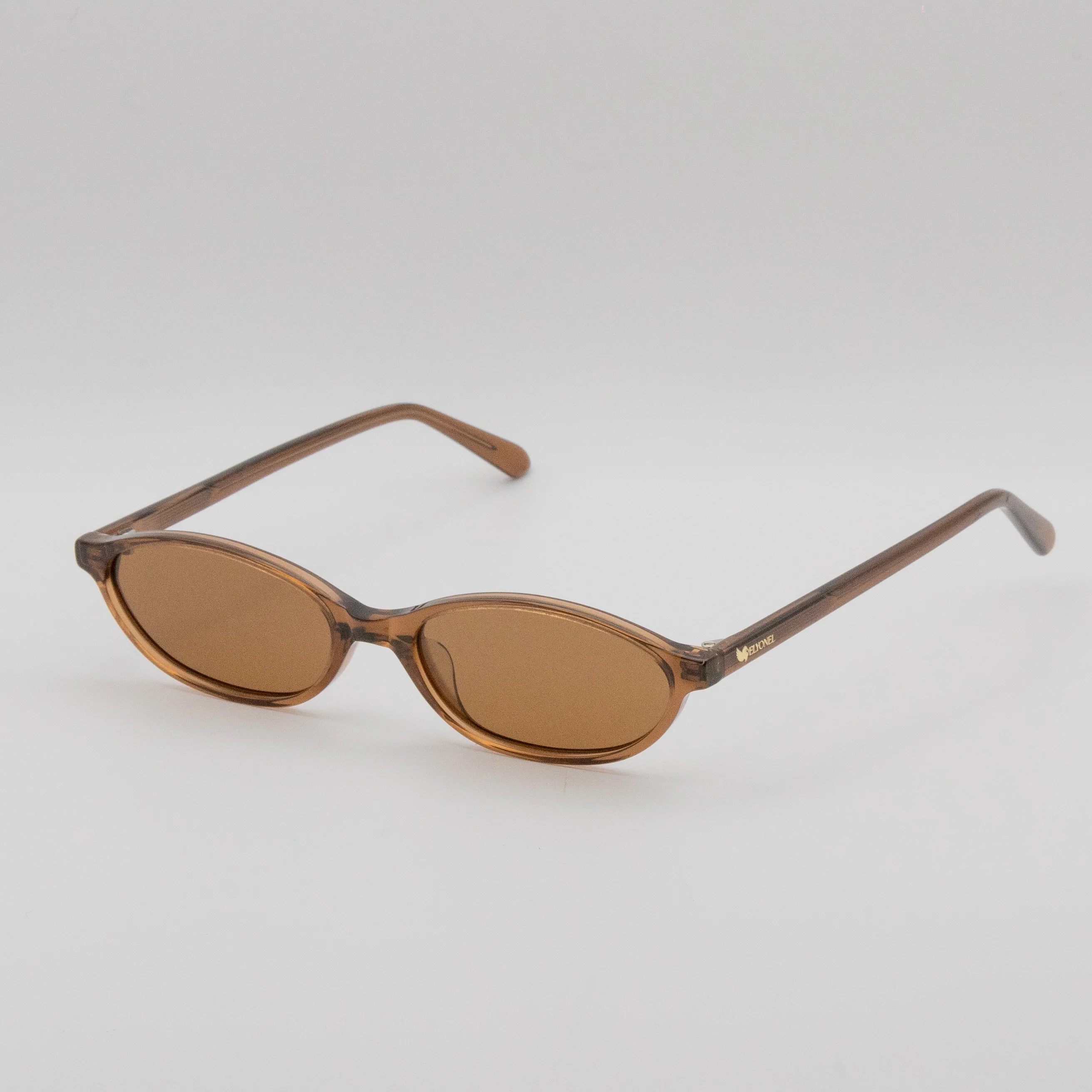 Monture ovale élancée en acétate brun ambré au design minimaliste et intemporel. Convient parfaitement aux visages fins à moyens. Modèle féminin. Idéal pour celles qui recherchent une allure élégante et artistique.