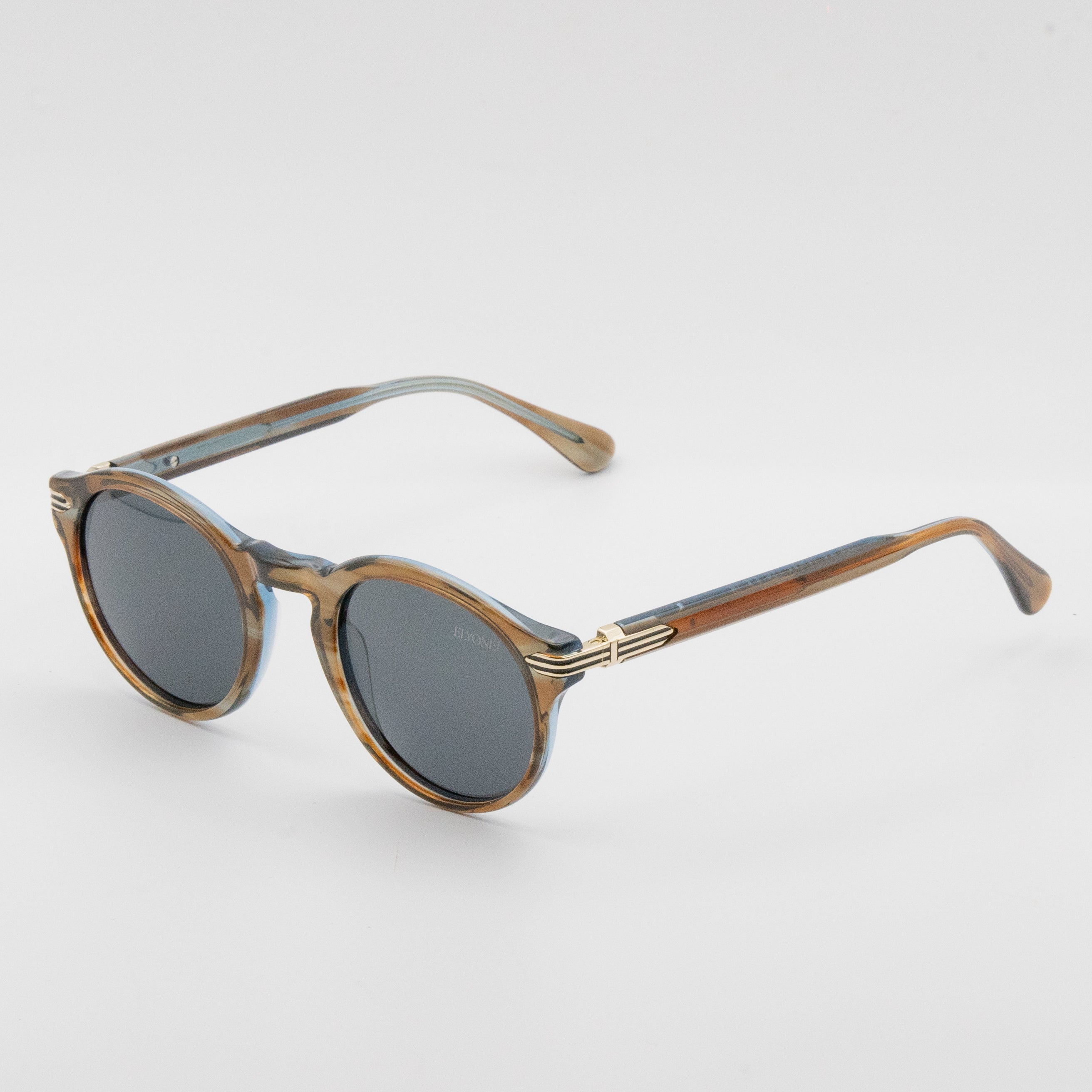 Les lunettes de soleil ANTONIO allient avec justesse l’élégance du design vintage et la modernité des finitions haut de gamme. Leur monture en acétate brun clair et bleu translucide révèle un jeu subtil de transparence et de reflets, sublimé par des détails dorés d’une finesse remarquable. Les verres gris foncé polarisés offrent une clarté visuelle exceptionnelle tout en affirmant une allure masculine, sophistiquée et assurée. Confortables, équilibrées et empreintes de caractère, les ANTONIO incarnent la vision d’un luxe discret — celui d’un style affirmé, intemporel et résolument distingué signé ELYONEL.